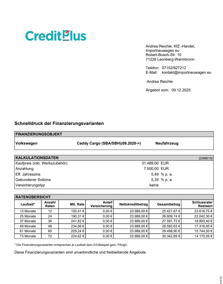 EU-NEUWAGEN - kurzfristig verfügbar, Lieferzeit ca. 1-2 Wochen!Im Endpreis ist alles nötige bereits enthalten, es kommen keine weiteren Kosten auf Sie zu:- zulassungsfertige Dokumente- Überführungkosten frei Leonberg- deutsche Bedienungsanleitungen- Erste-Hilfe-Set (Verbandstasche, Warnweste, Warndreieck)- Fahrzeugaufbereitung- Einweisung in das FahrzeugVW CADDY Cargo Maxi 2.0 TDI SCR 75 KW/102 PS 6-Gang, Euro 6eFarbe: Candy Weiß Innenausstattung: TitanschwarzSonderausstattung (diese ersetzt teilweise die Serienausstattung)+ Komfort Paket (Handschuhfach auf der Beifahrerseite, beleuchtet und abschließbar; Vordersitze höhenverstellbar; 230V-Steckdose im Fahrerhaus; LED-Innenraumbeleuchtung im Laderaum, 2 LED-Spotleuchten; Armlehne für den Fahrersitz; Ablagefach in der Dachkonsole; 2 Haltegriffe in der Dachkonsole; Lehnenentriegelung für den Beifahrersitz)+ Assistenzpaket (Außenspiegel elektrisch verstellbar, beheizbar und anklappbar, auf der Fahrerseite asphärisch; Digital Cockpit; ParkPilot – Parksensoren vorn und hinten; Rückfahrkamera „Rear Assist“; Komfortstartfunktion „Keyless Start“)+ Kunststoffboden im Fahrgast-/Laderaum+ 3-Speichen-Multifunktionslederlenkrad inkl. Schaltknauf in Leder+ App-Connect inkl. Wireless App-Connect (für Apple CarPlay und Android Auto)+ Lendenwirbelstützen vorn+ Außenspiegel in Hochglanzschwarz+ Vordersitze höhenverstellbar inkl. Verstauschubladen unter den Vordersitzen+ Make-up-Spiegel + 12V-Steckdose im offenen Ablagefach im Armaturenbrett+ Raucherausführung (Zigarettenanzünder, Aschenbecher)+ LED-Scheinwerfer für Abblend- und Fernlicht mit LED-TagfahrlichtSerienausstattung (auszugsweise): Radio „Composition“ mit 10“ Farbtouchscreen, 2 Lautsprechern, FM-Empfang, Bluetooth Freisprecheinrichtung und 2 USB-C-Schnittstellen (auch iPod/iPhone fähig); Automatische Fahrlichtschaltung; Reserverad in Fahrbereifung (Stahl); H7 Halogenscheinwerfer; Tagfahrlicht; ESP; ASR; ABS; EDS; MSR; Bremsassistent; Multikollisionsbremse; Normalsitze; Fahrersitz höhenverstellbar; Berganfahrassistent; 3-Speichen-Multifunktionslenkrad; Schaltknauf in Kunststoff; Lenksäule höhen- und längsverstellbar; Klimaanlage "Climatic"; Ohne Dekoreinlagen; Sonnenblenden; Außenspiegel elektrisch verstellbar und beheizbar, auf der Fahrerseite asphärisch; Stahlfelgen 6Jx15 mit Radvollblenden; Reifen 205/65 R15; 2-Sitzer-Version (Sitzkonfiguration 2-0-0) – 1. Sitzreihe mit Einzelsitz auf der Beifahrerseite, 2.Sitzreihe ohne Sitze, 3.Sitzreihe ohne Sitze; Müdigkeitserkennung; Schiebetür im Laderaum rechts; Teppichbodenbelag im Fahrerhaus; Ohne Bodenbelag im Laderaum; Digital Cockpit; Ablagefächer im Armaturenbrett; Vorbereitung für Dachträgerbefestigung; Heckflügeltüren ohne Fenster; Hohe Trennwand ohne Fenster; 12V-Steckdose in der Mittelkonsole vorn; Sommerreifen; Offenes Ablagefach auf der Beifahrerseite; Schiebetürschiene in Silber; Garantieverlängerung auf 4 Jahre/120.000 km maximale Gesamtlaufleistung; Reifendruckkontrollsystem; ParkPilot – Parksensoren hinten; Spurhalteassistent "Lane Assist"; Umfeldbeobachtungssystem "Front Assist" mit City-Notbremsfunktion; Fußgängererkennung; Kopfairbags vorn; Seitenairbags vorn; Tempomat mit Geschwindigkeitsbegrenzer